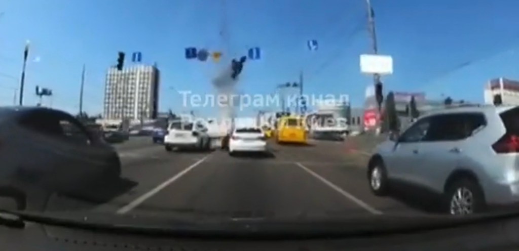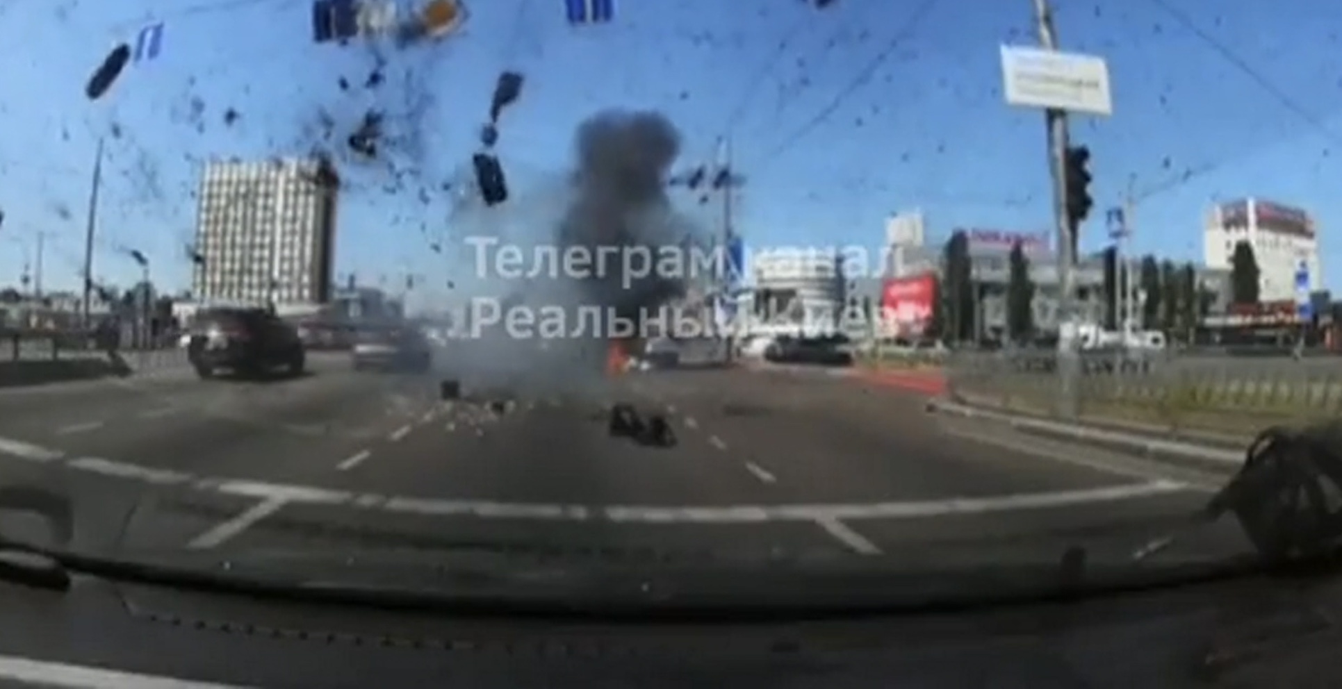 De kruisraket werd door Oekraïens luchtafweer onderschept, maar de brokstukken kwamen op een drukke weg terecht, waar een dashcam toevallig beelden van opnam. Voor zover bekend kwamen de automobilisten ter plekke met de schrik vrij.