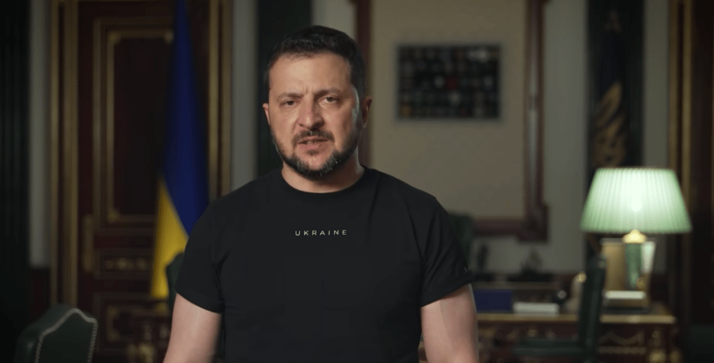 President Zelensky tijdens zijn video-boodschap (screenshot)