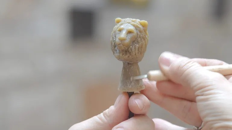 Het hele tafereel is geplaatst op een groene ondergrond met struikgewas en gezien de wapperende sjaal, verentooi en leeuwenmanen lijkt het flink te waaien!
