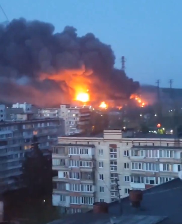 Het bombardement veroorzaakte een grootschalige brand in de turbinehal. Gisteren werden er pogingen ondernomen om de brand onder controle te krijgen.