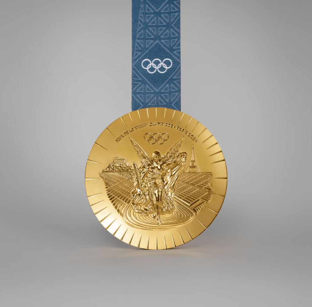 De Olympische medailles zijn een ontwerp van juwelier Chaumet, naast de metalen goud, zilver en brons bevat iedere plak een stukje Eiffeltoren: in het midden van de medailles zien we een ijzeren zeshoek, gemaakt van restanten van recente renovaties van de iconische toren. De zeshoek verwijst naar de globale vorm van Frankrijk, het Olympische Marianne-logo is erop aangebracht, compleet met ringen.