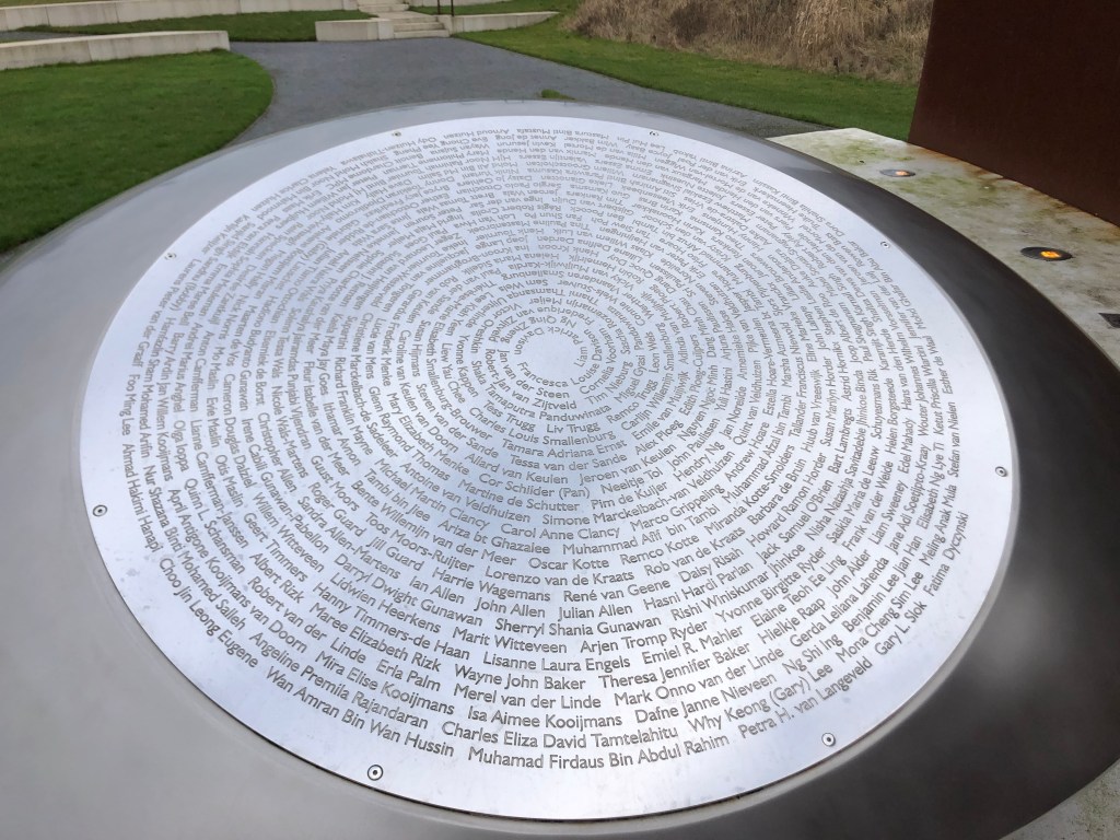 Alle namen van de omgekomen inzittenden van Vlucht MH-17 bij het Nationaal Monument MH-17 (Het Oog) in Vijfhuizen (foto: Vlagblog)