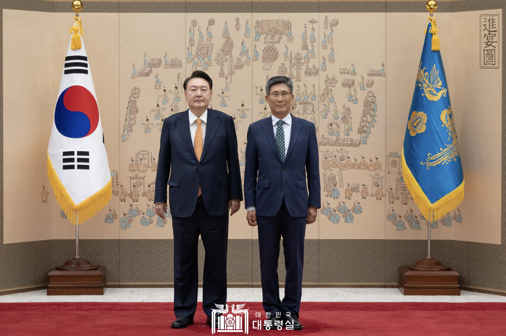 De presidentiële vlag is blauw met twee goudkleurige, naar elkaar toegewende feniksen, tussen de staarten van de fabeldieren een eveneens goudkleurige hibiscusbloem, om precies te zijn de Hibiscus syriacus. Hoewel specifieke bronnen ontbreken, lijkt de de vlag in 1967 te zijn ingevoerd, waarbij het ontwerp hetzelfde is als dat van het al langer in gebruik zijnde zegel van Zuid-Koreaanse presidentschap, dat in ieder geval tot 1960 teruggaat.