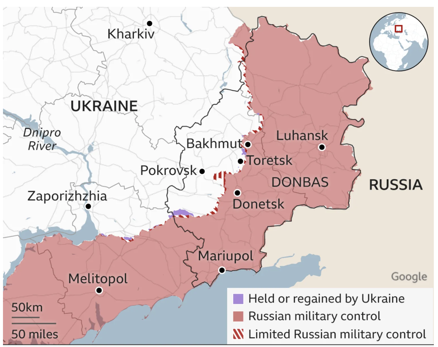 Volgens het Kremlin zouden deze week de dorpen Zalizne en Niu-York zijn veroverd, hoewel Oekraíne volhoudt dat beide dorpen nog deels onder hun controle zijn, maar omdat zij minder manschappen achter de hand hebben, is de strijd zwaar en ongelijk.