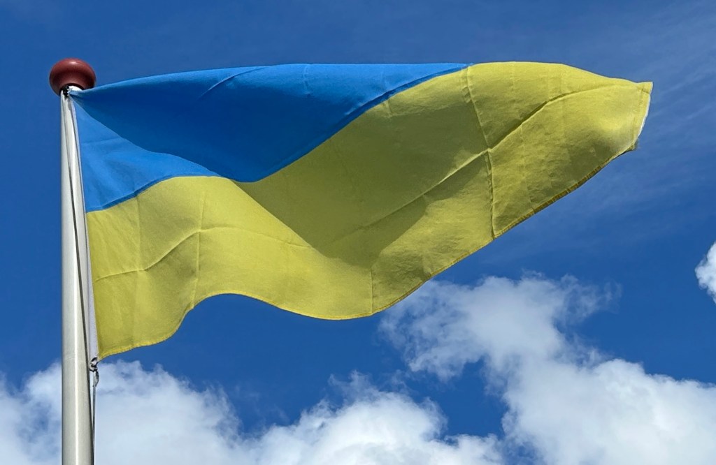 De vlag van Oekraïne bestaat uit twee even brede horizontale banen van blauw en geel.