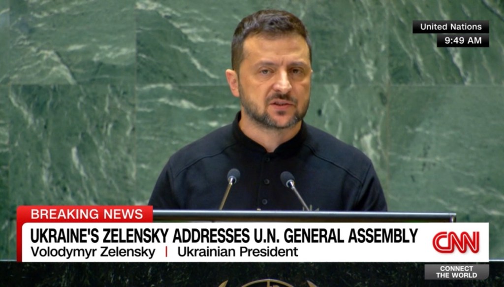 President Zelensky tijdens zijn toespraak voor de Algemene Vergadering van de Verenigde Naties in New York, gisteren (screenshot)