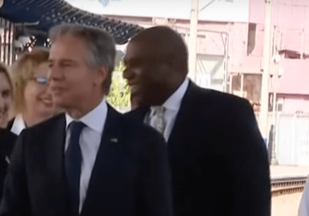 De Amerikaanse en Britse ministers van Buitenlandse Zaken, Blinken en Lammy, bij hun aankomst op het treinstation van Kiev (screenshot)