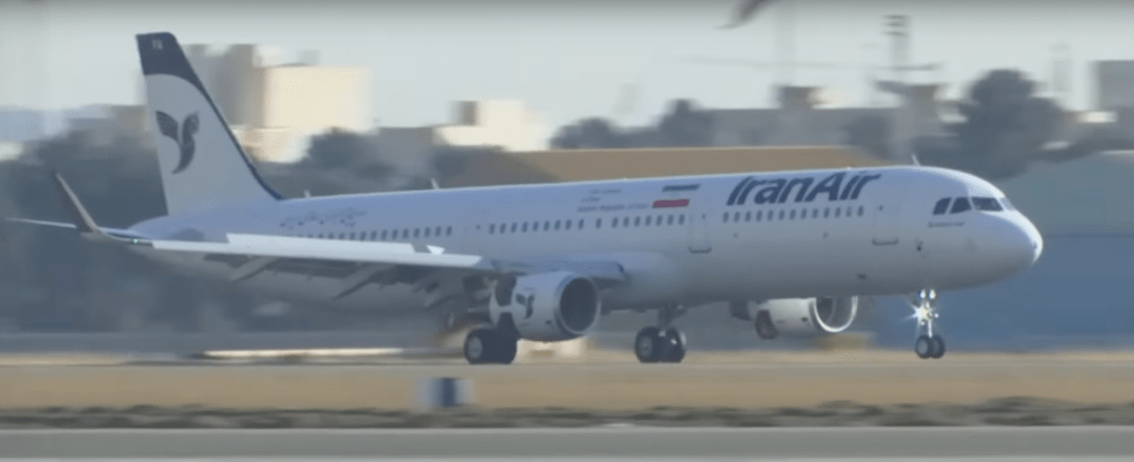 Een Airbus-toestel van Iran Air bij de landing (screenshot)