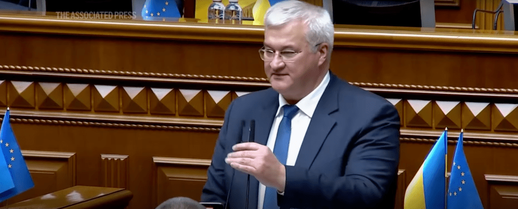 Andrii Sybiha (1975), de nieuwe Oekraïense minister van Buitenlandse Zaken, bij zijn installatie afgelopen vrijdag (screenshot)
