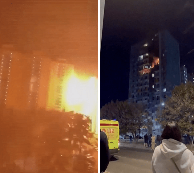 Een Oekraïense drone slaat in een flatgebouw in (links), waarna er brand ontstaat op twee verdiepingen (rechts) (screenshots)