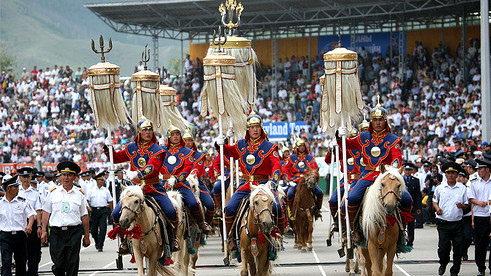 De rode kleur werd tot 1992 uitgelegd als kleur van de revolutie, nu als symbool voor voorspoed en liefde. Het blauw stond -en staat- voor de eeuwig blauwe hemel, het is tevens de traditionele kleur van Mongolië.