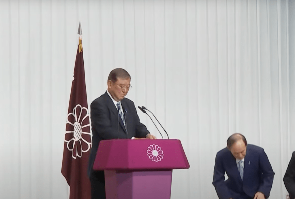 Premier Shigeru Ishiba (1957) van Japan, met achter hem de vlag (ingevoerd in 1955) van zijn conservatieve Liberale Democratische Partij (screenshot)