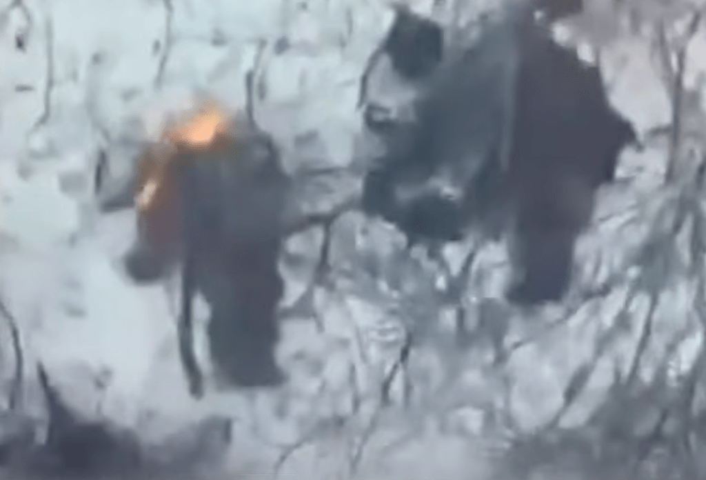 Screenshot uit een halve minuut durend filmpje waarop volgens president Zelensky het gezicht van een gedode Noord-Koreaanse militair wordt verbrand om identificatie te voorkomen, maar het is schier onmogelijk hier iets met zekerheid over te kunnen zeggen, daar is het beeld te onduidelijk voor (filmpje gedeeld via Telegram)