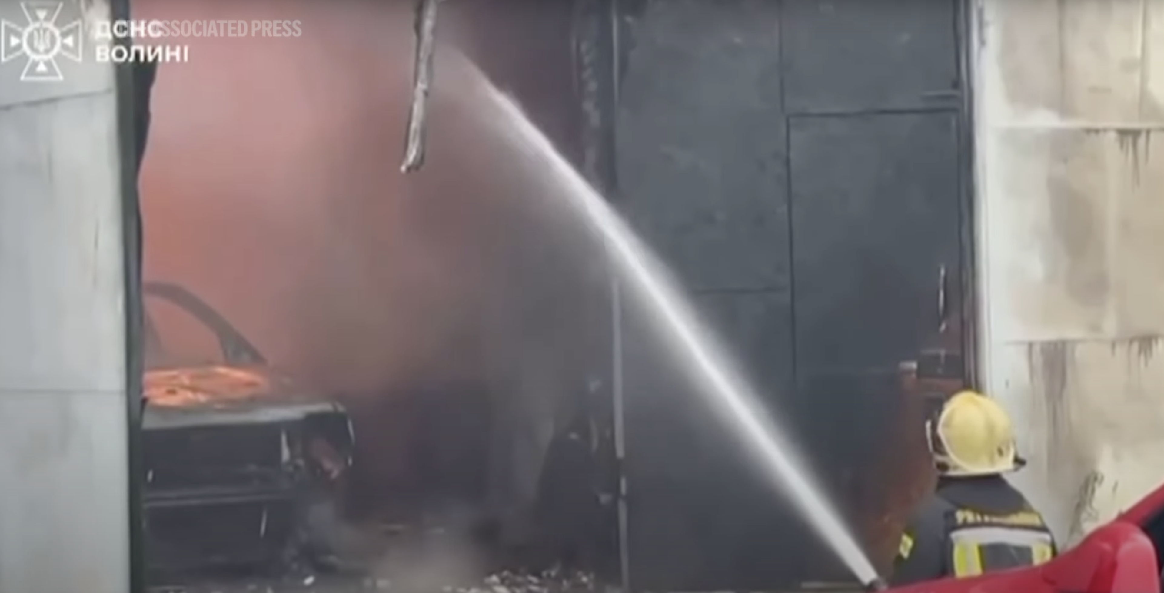 Een brandweerman tijdens bluswerkzaamheden in de noordwestelijke stad Loetsk (screenshot)