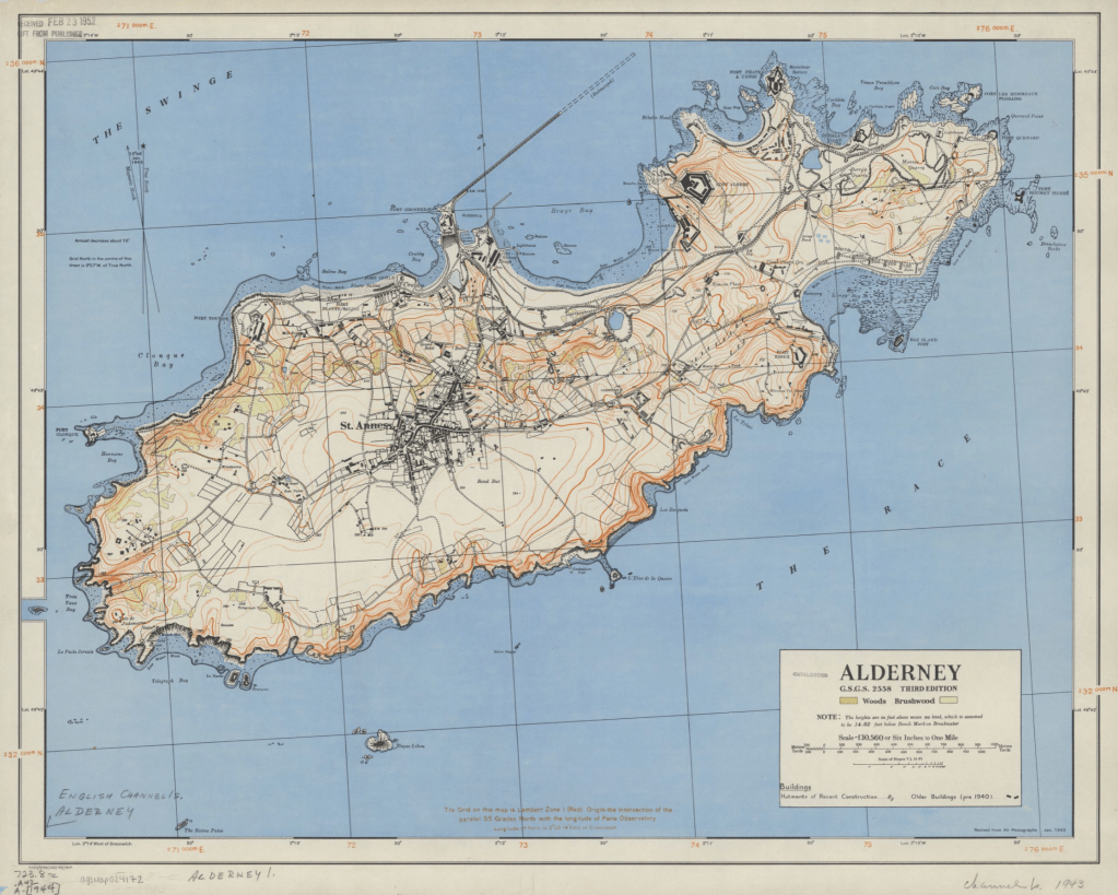 Kaart van Alderney uit 1944(United Kingdom War Office, General Staff, Geographical Section (publiek domein)