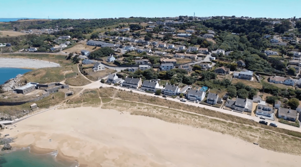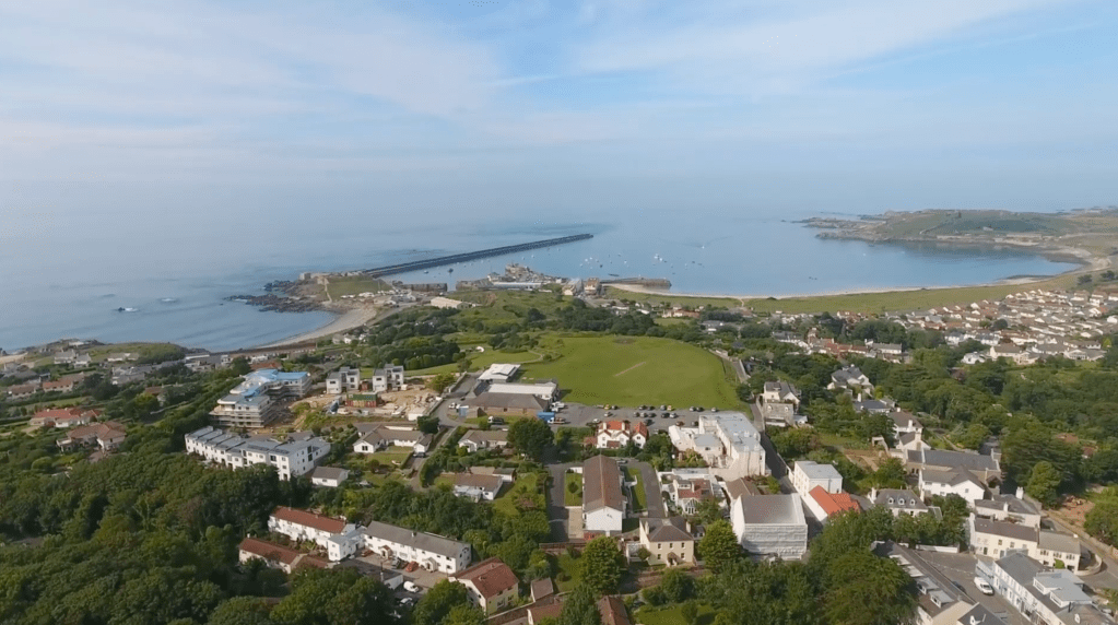 Alderney’s hoofdstad Saint Anne (‘Town’), met Braye Bay en zijn ver in zee stekende golfbreker (screenshot)
