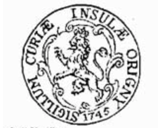 Zegel van Alderney uit 1745, waarop we de leeuw voor het eerst tegenkomen, inclusief de oerversie van de sierrand van de latere badge, de tekst “Sugillum Curiae Insulae Origny 1745”, dat zoveel betekent als “Zegel van de Staten van Alderney”