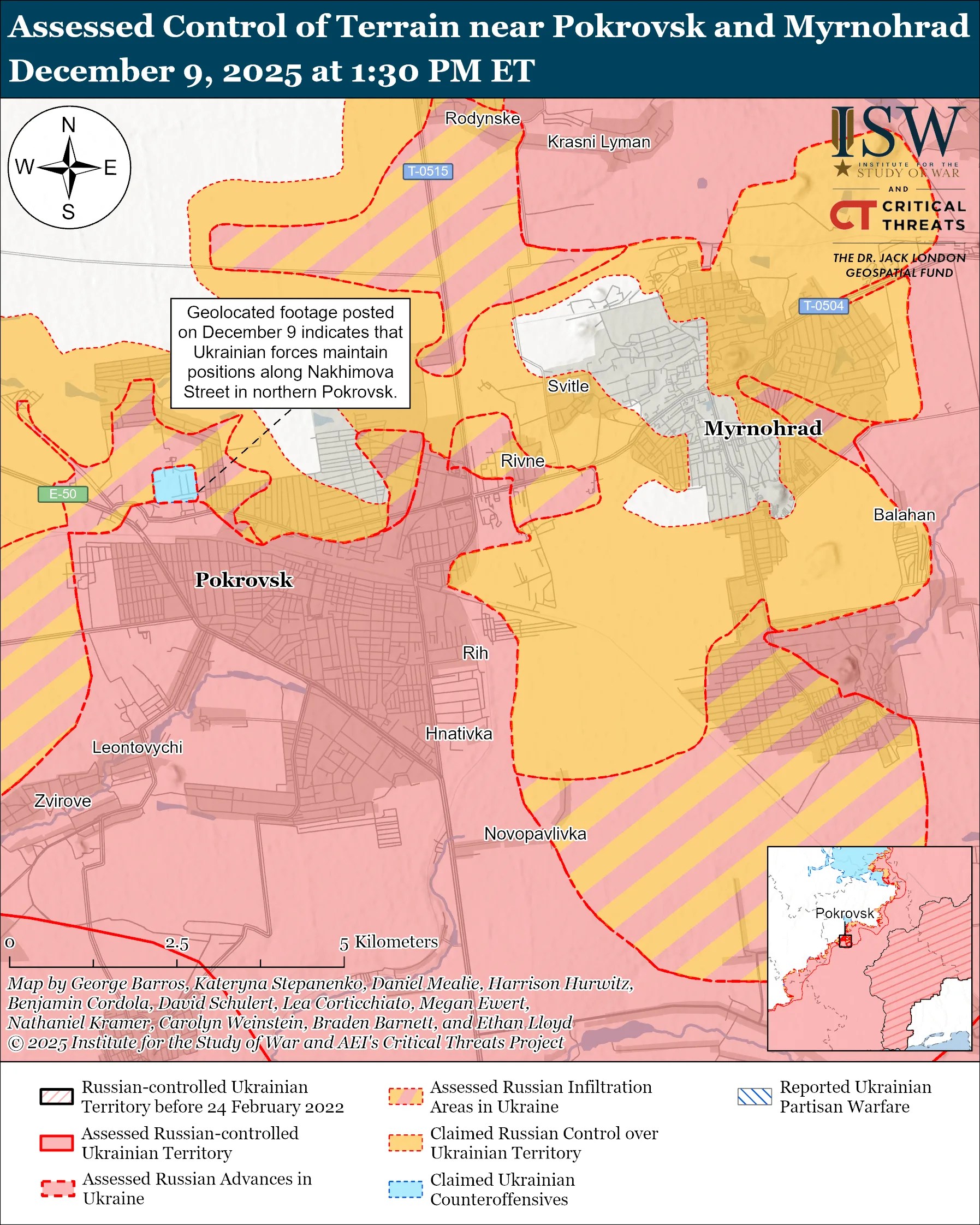 Omdat de weg naar Myrnohrad via Pokrovsk niet langer toegankelijk is – aangezien Pokrovsk grotendeels onder Russische bezetting staat -, zijn Oekraïense eenheden gedwongen routes te gebruiken via twee kleine dorpjes, Rivne en Svitle. Een deel van Rivne staat onder Russische controle en het Russische Ministerie van Defensie heeft beelden vrijgegeven waarop hun troepen daar te zien zijn.