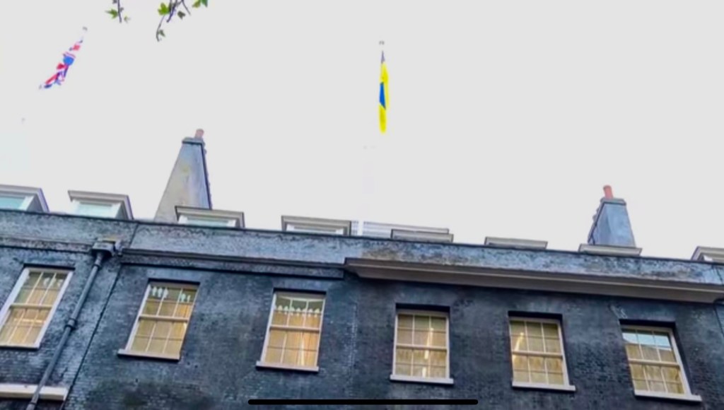 De Union Flag (of Union Jack) en de Oekraïense vlaggen op het dak van Downing Street (screenshot)