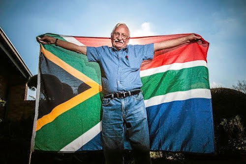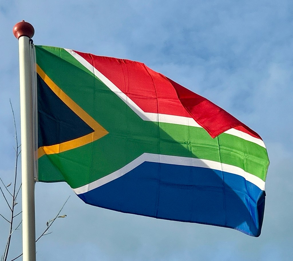 De vlag van Zuid-Afrika werd ingevoerd op 27 april 1994. De basis is een rood-wit-blauwe driekleur. Daaroverheen werd een een groene, zich in tweeën splitsende baan gelegd, in de vorm van een horizontale letter Y. De poten van de Y strekken zich uit naar de mastzijde. Binnen de daardoor gevormde driehoek is een zwarte driehoek zichtbaar. Een gele rand ligt tussen de groene en zwarte kleuren.