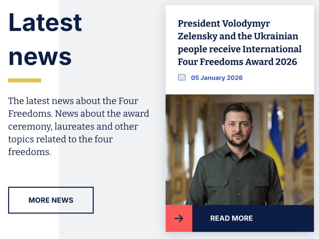 Op maandag 6 januari maakte Hugo de Jonge, Commisaris van de Koning in Zeeland, bekend dat de International Four Freedoms Award 2026 is toegekend aan president Zelensky en Oekraïne.