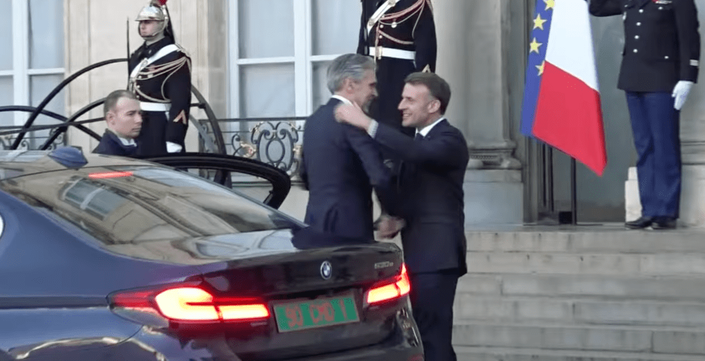 De Franse president Macron begroet NAVO-secretaris-generaal Rutte bij het Élysée-paleis (screenshot)
