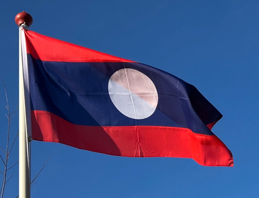 De vlag van Laos is een horizontale driekleur van rood-blauw-rood, waarbij de middelste blauwe baan even hoog is als de tweed rode samen. Midden op de blauwe baan staat een witte cirkel.