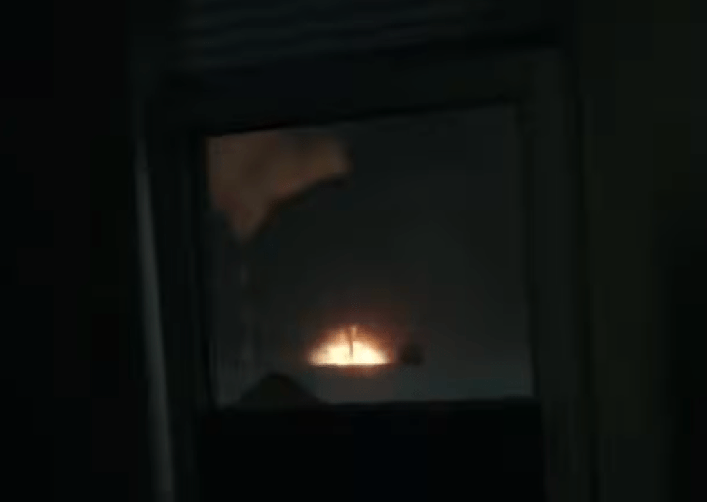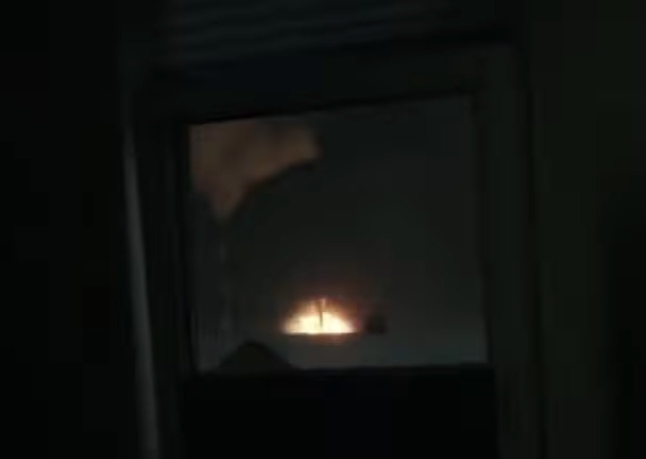 Door de achterdeur-ruit filmt een Rus een ontploffing op energie-infrastructuur in Belgorod (screenshot)