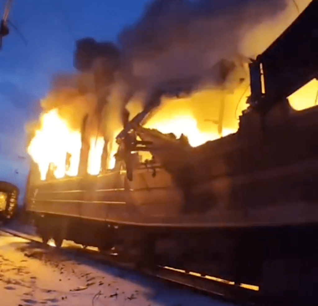 In de door een drone geraakte wagon brak brand uit (screenshot)