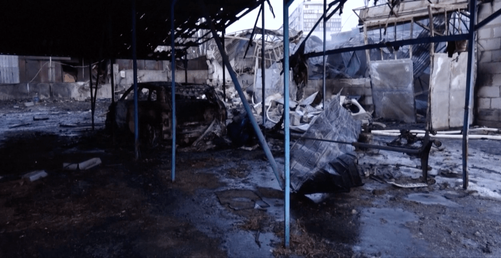 Rokende puinhopen naa een Russische aan val in Kiev afgelopen week (screenshot)