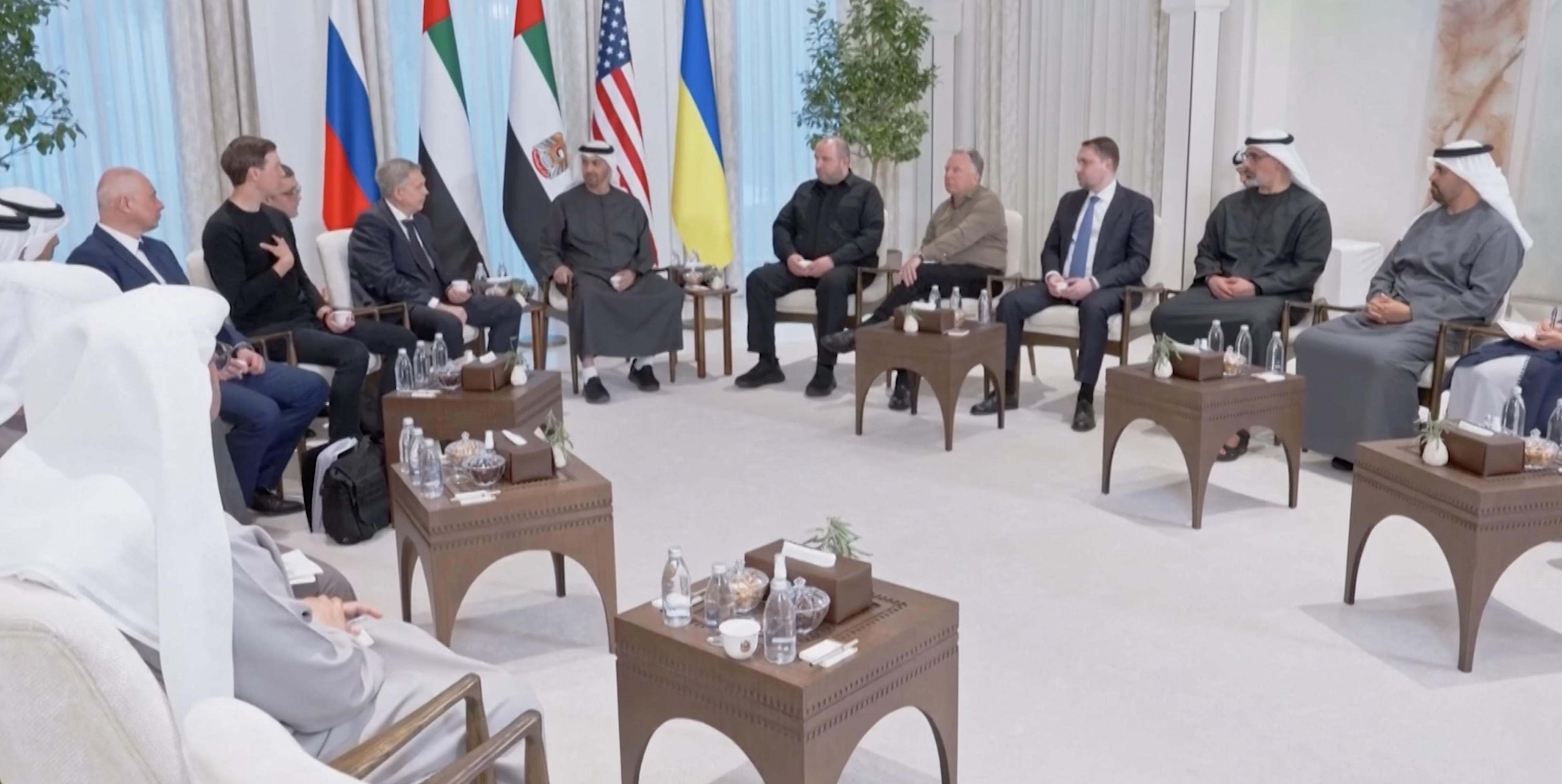 De vredesbesprekingen in Abu Dhabi stonden onder leiding van Mohammed bin Zayed Al Nahyan(in het midden), president van de Verenigde Arabische Emiraten en emir van Abu Dhabi (screenshot)
