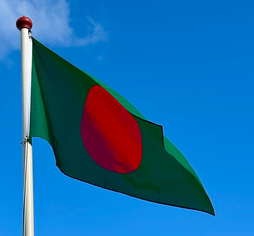 De vlag van Bangladesh is groen met een rode cirkel iets links van het midden. De vlag stamt uit februari 1971 en is een creatie van schilder Quamrul Hassan.