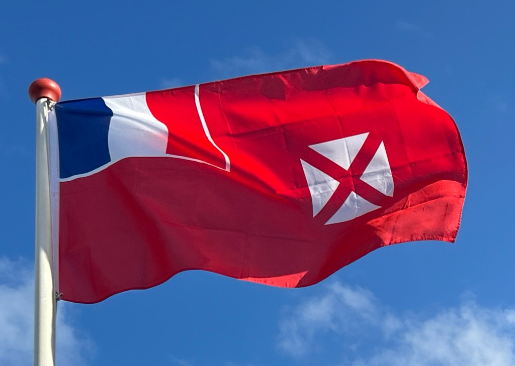De Franse vlag, de Tricolore, is de officiële vlag, maar er is sinds 1985 wel degelijk een vlag voor de eilanden, de officieuze dus en die zien we hier vandaag.