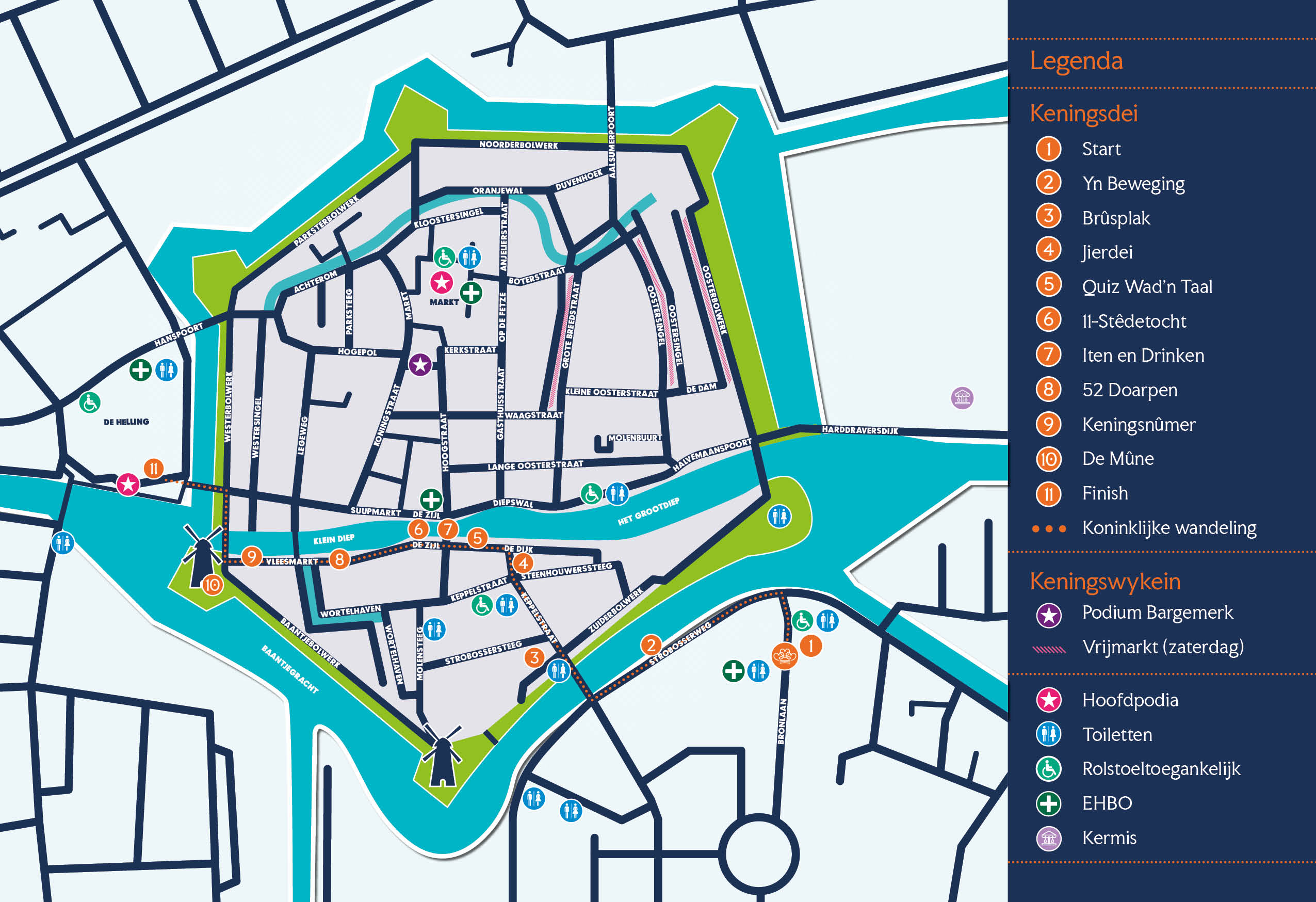 Plattegrond van Dokkum met de verschillende plekken waar het koninklijk gezelschap langs zal komen (© keningsdei.frl)