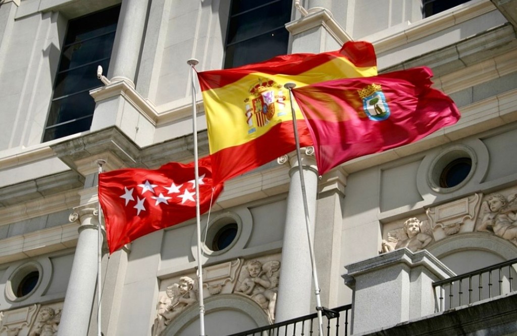 Nogmaals de vlag van Madrid, samen met de vlaggen van Spanje en die van de regio Madrid (© Contando Estrelas / publiek domein)