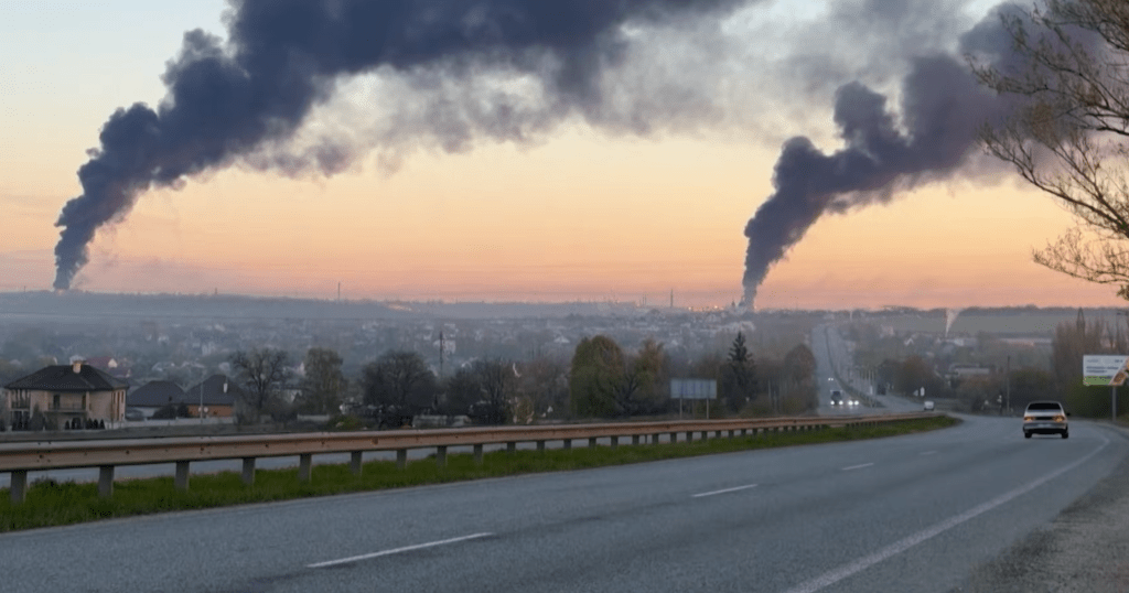 Beeld uit dezelfde video, waarop een grote rookpluim te zien is boven de opslagplaats bij Ovrazhky (screenshot)