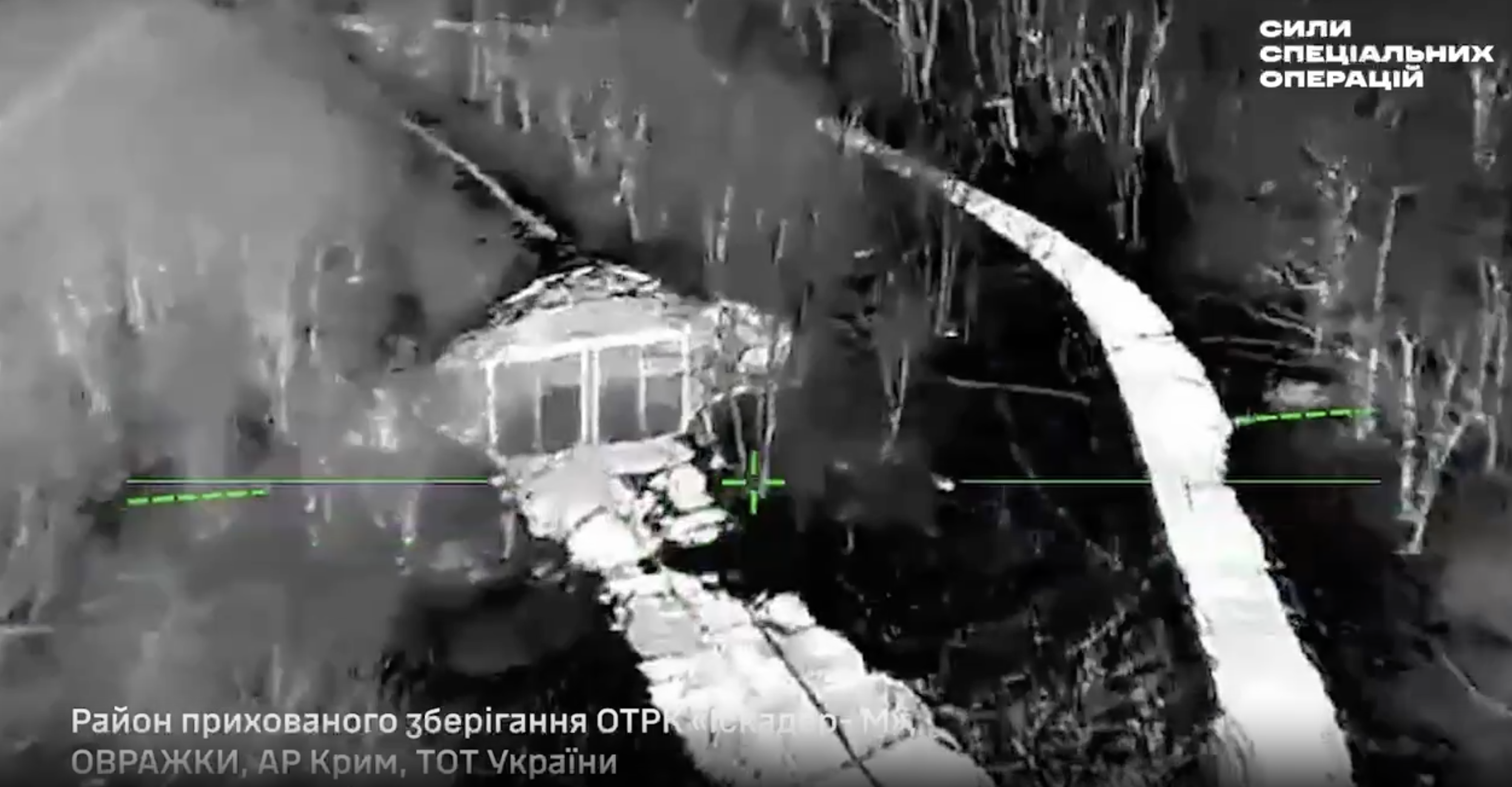 Beeld uit de door de SOF vrijgegeven video van de aanval, waarop een opslagplaats te zien is, net vóórdat een een Oekraïens projectiel doel trof (screenshot)