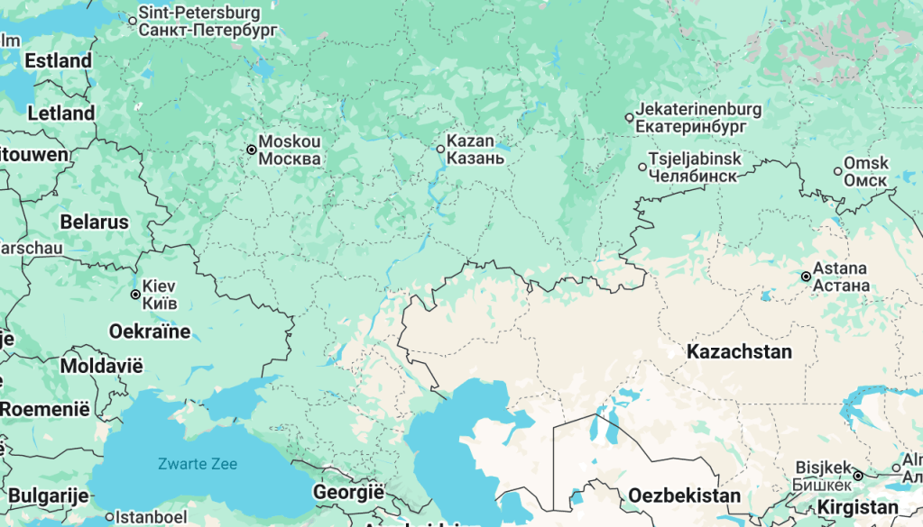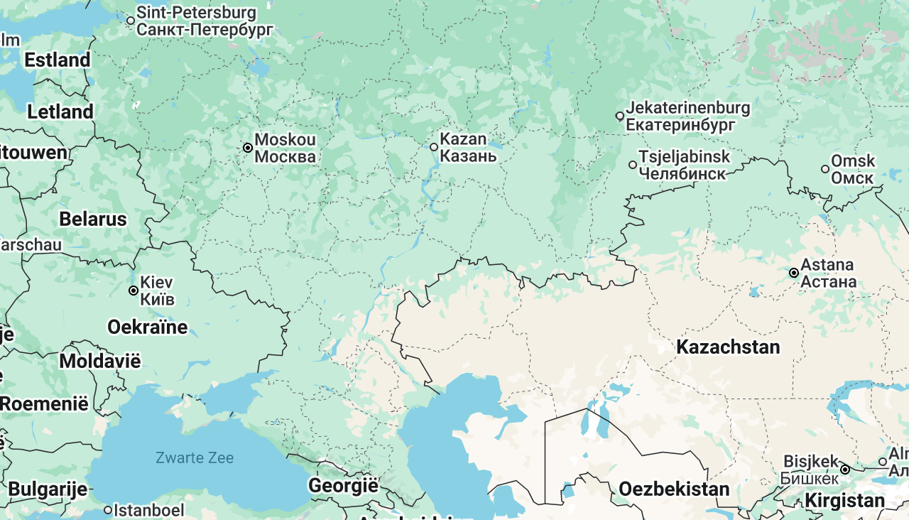 Op deze kaart is goed te zien hoe ver Jekaterinenburg (rechtsboven) van Oekraïne vandaan ligt (© Google Maps)