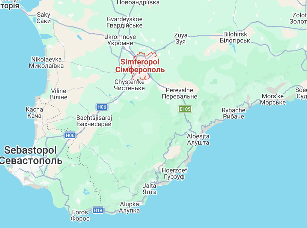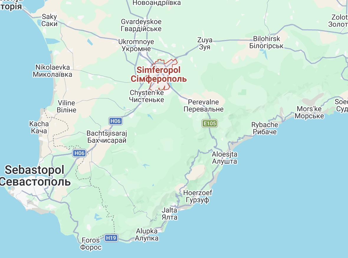 Het dorp Ovrazhky (niet op de kaart vermeld), locatie van de Iskander-rakettenopslagplaats, is net ten zuidwesten van Bilohirsk, op het bezette Krim-schiereiland (© Google Maps)
