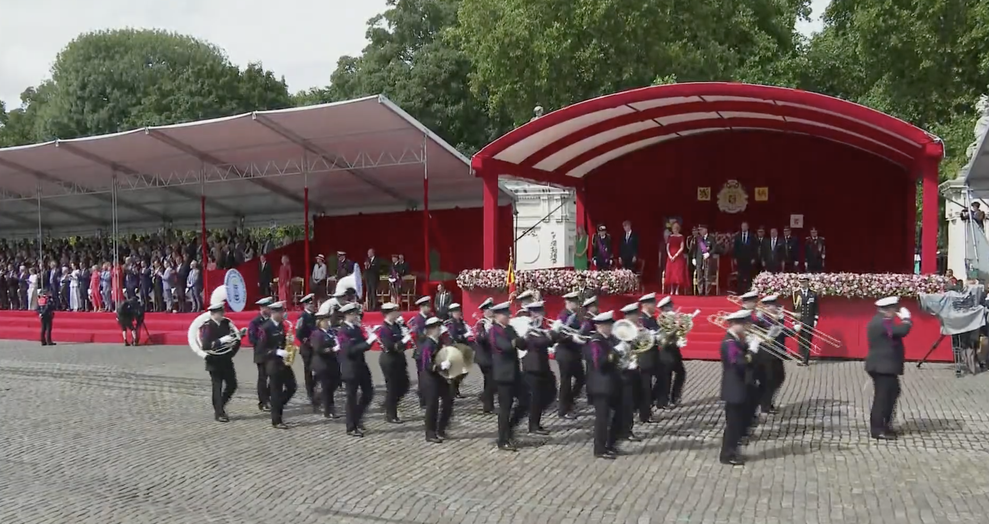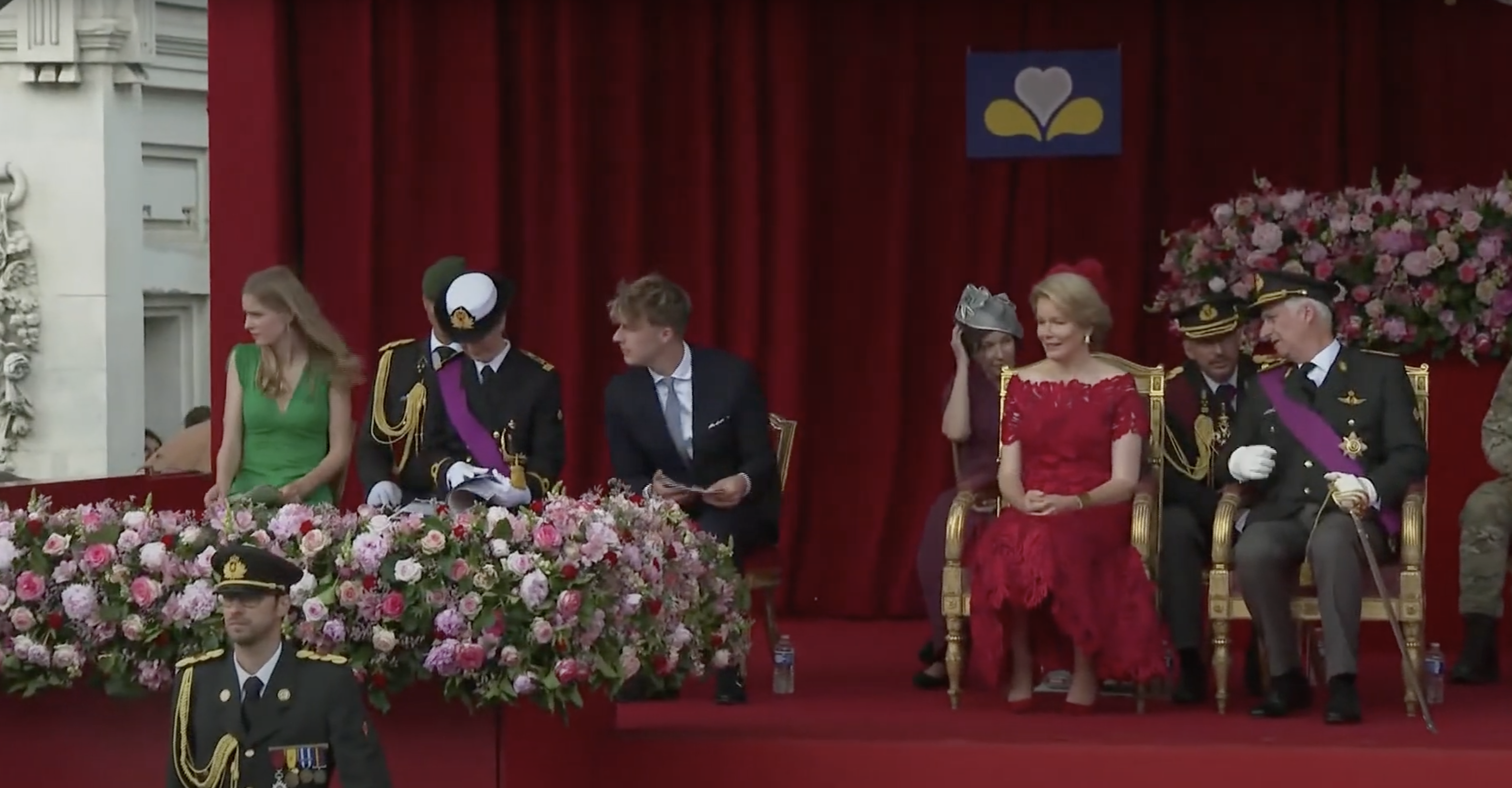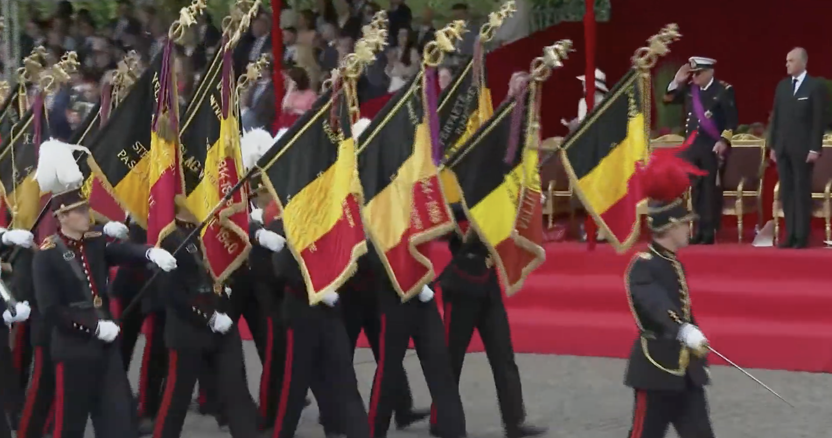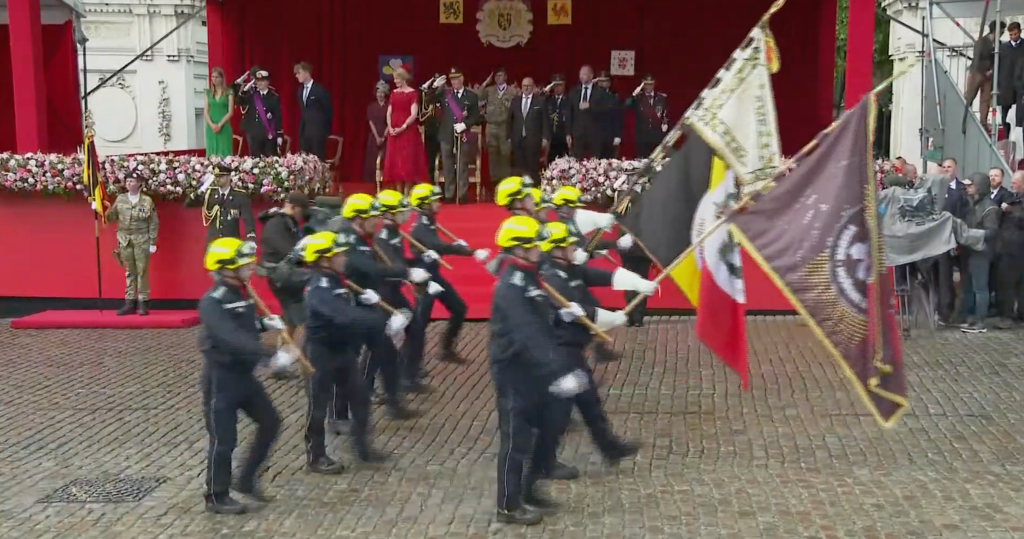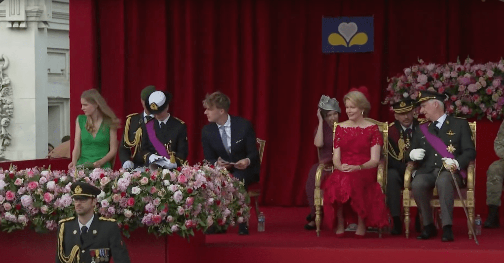 Koning Filip en koningin Mathilde arriveren bij het erepodiumLinks op het podium drie van de vier kinderen van het koninklijk paar, v.l.n.r. de prinsessen Eléonore, Elisabeth (de hertogin van Brabant en kroonprinses) en prins EmmanuelHet koninklijk paar vlak voor de paradeNaast het hoofdpodium waren de overige familieleden present, v.l.n.r. James O’Hare, prinses Delphine, prinses Claire, prins Laurent, prins Lorenz en prinses AstridDe parade werd geopend met muziekMode-experts wisten te melden dat de koningin gekleed ging in een kanten jurk van Modehuis Natan en een hoed van ontwerpster Fabienne DelvigneDe vaandels van de verschillende legeronderdelen maken hun opwachtingKoning Filip groet de vaandels in zijn rol van opperbevelhebber van het Belgische legerNa afloop schudde de koning nog de nodige handen
