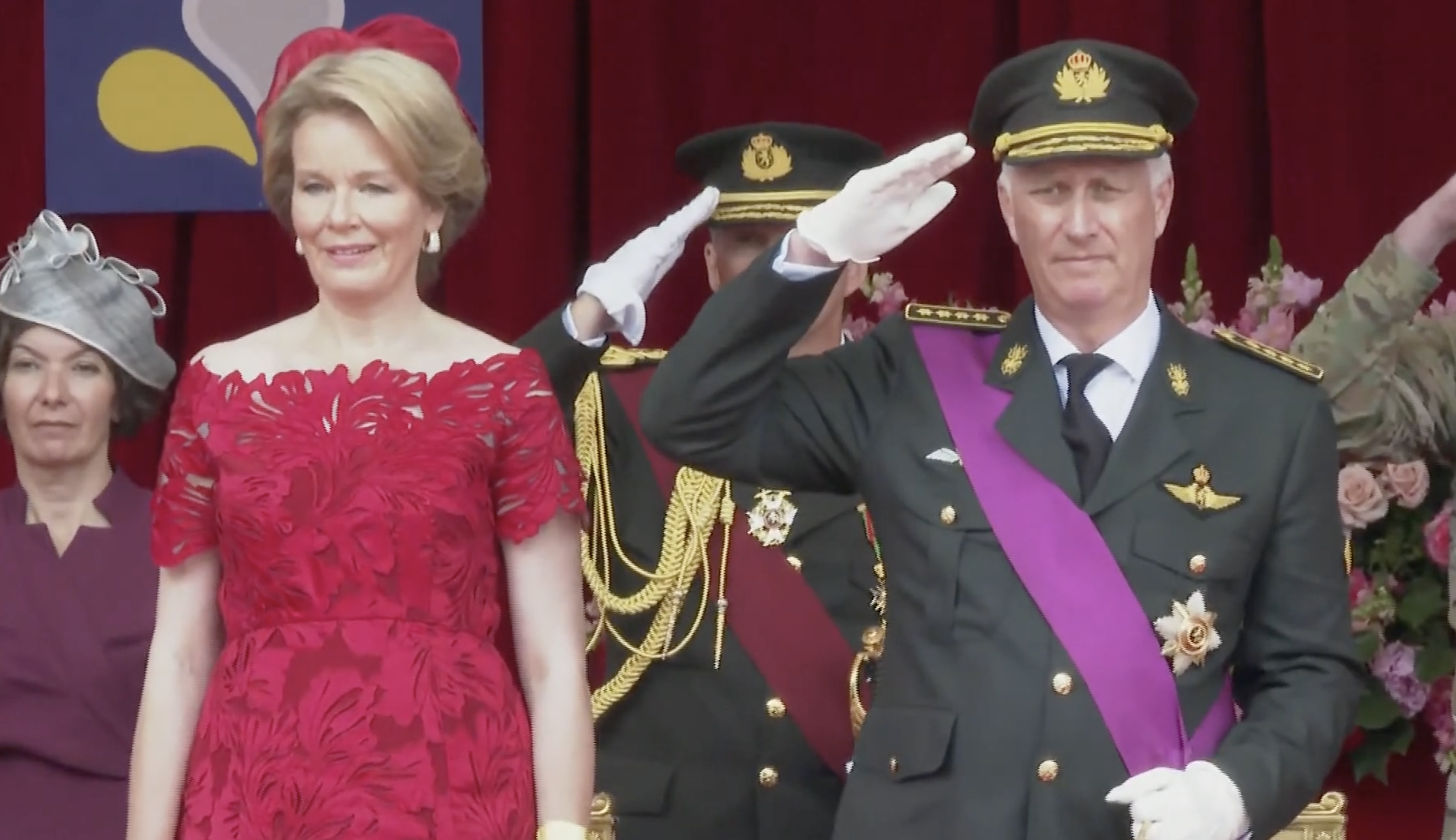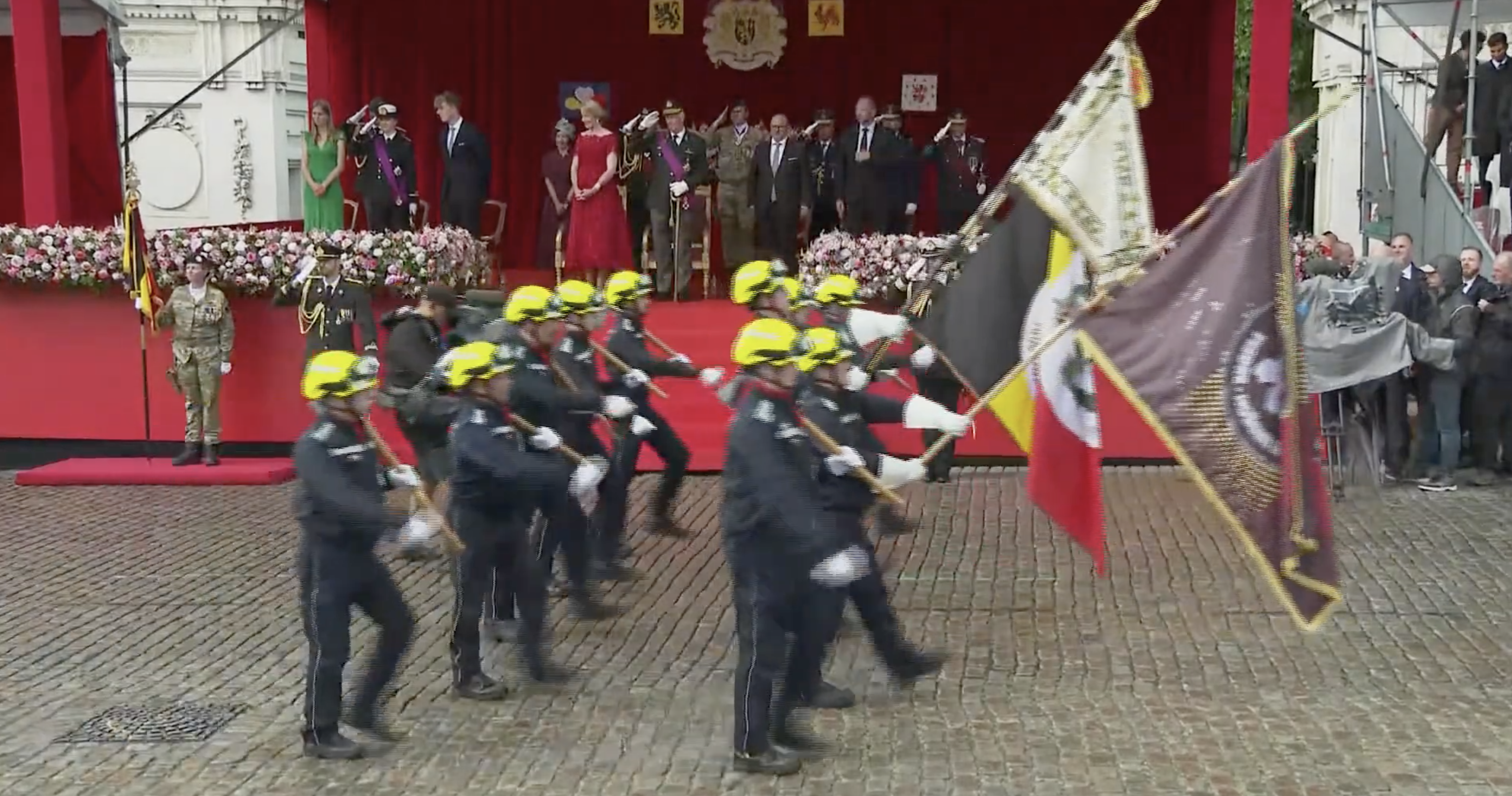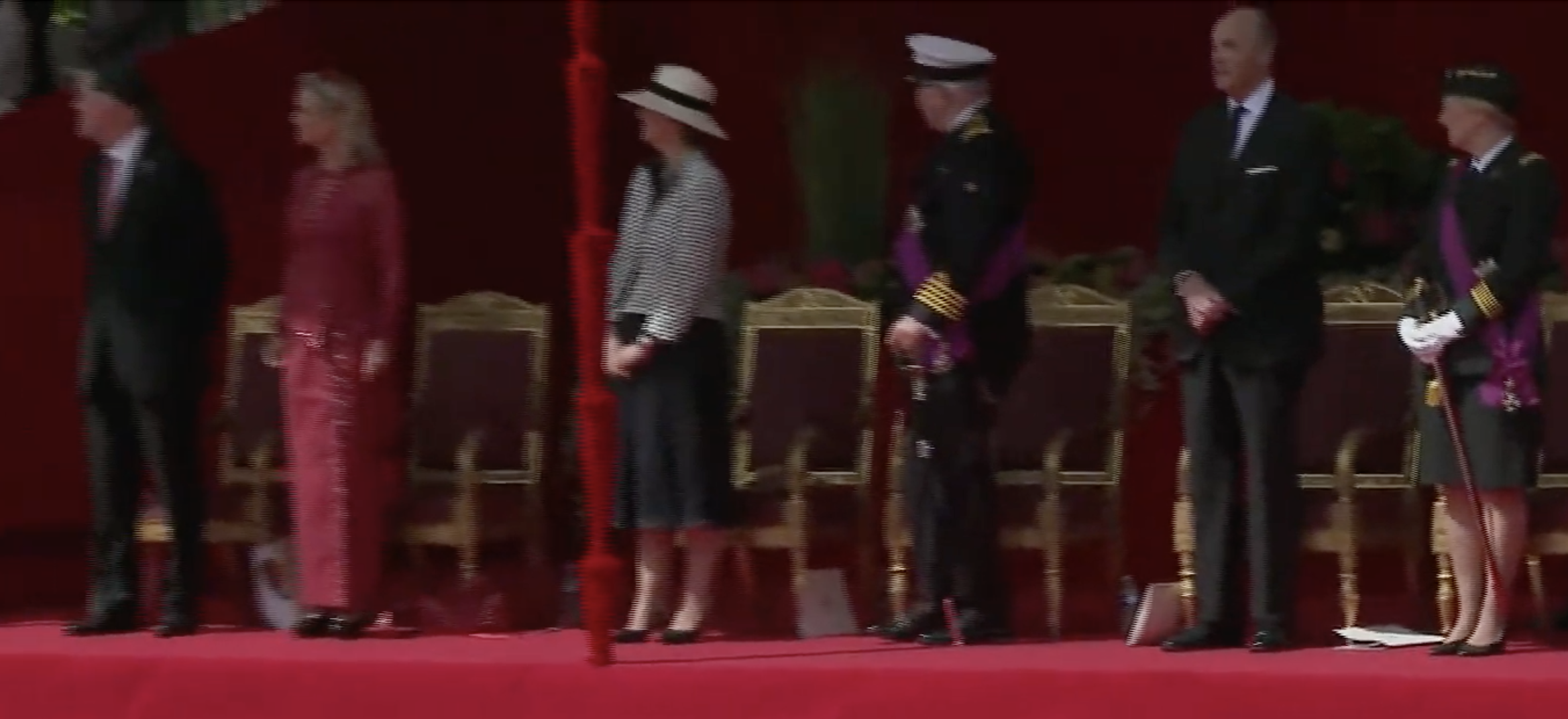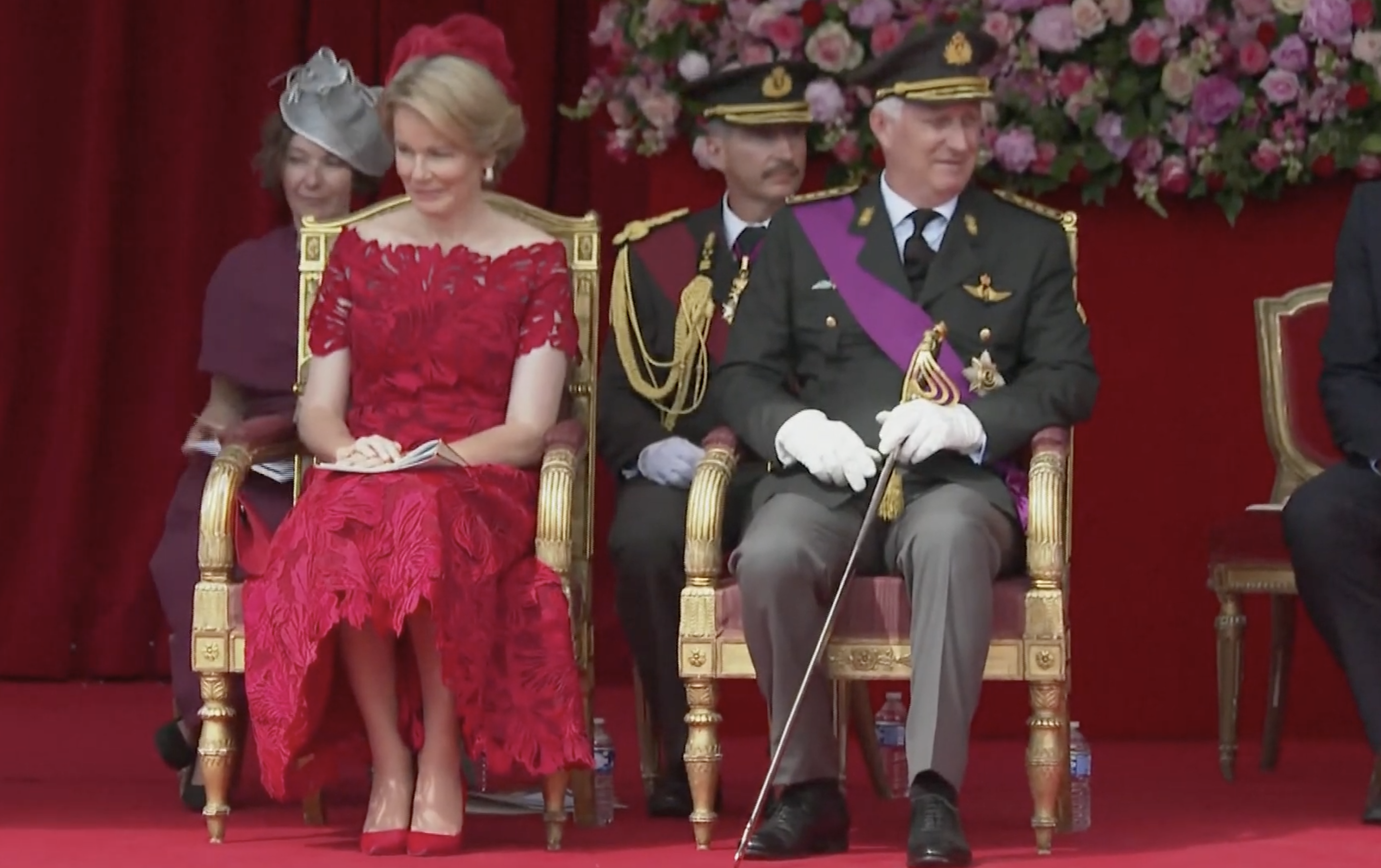 Koning Filip en koningin Mathilde arriveren bij het erepodiumLinks op het podium drie van de vier kinderen van het koninklijk paar, v.l.n.r. de prinsessen Eléonore, Elisabeth (de hertogin van Brabant en kroonprinses) en prins EmmanuelHet koninklijk paar vlak voor de paradeNaast het hoofdpodium waren de overige familieleden present, v.l.n.r. James O’Hare, prinses Delphine, prinses Claire, prins Laurent, prins Lorenz en prinses AstridDe parade werd geopend met muziekMode-experts wisten te melden dat de koningin gekleed ging in een kanten jurk van Modehuis Natan en een hoed van ontwerpster Fabienne DelvigneDe vaandels van de verschillende legeronderdelen maken hun opwachtingKoning Filip groet de vaandels in zijn rol van opperbevelhebber van het Belgische legerNa afloop schudde de koning nog de nodige handen