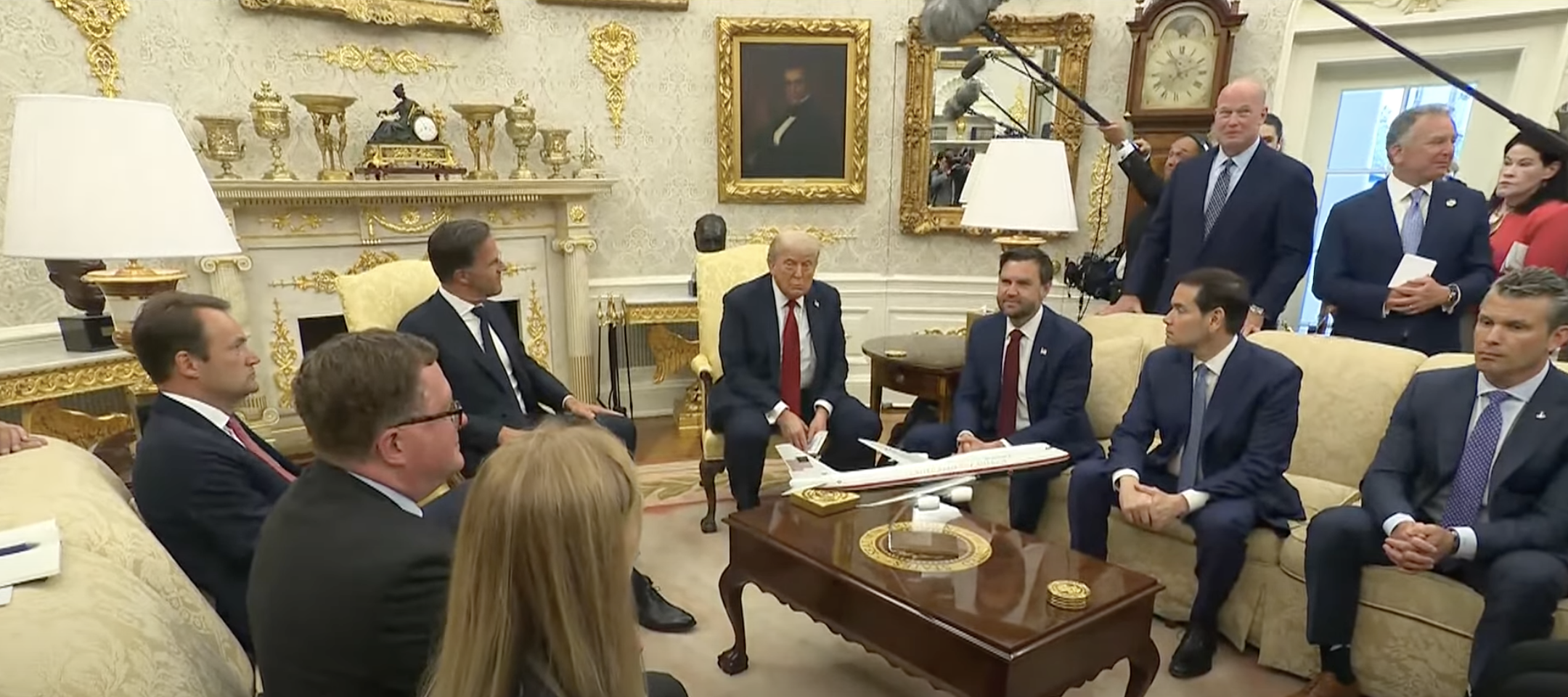 Bezoek van NAVO-chef Mark Rutte aan het Witte Huis, naast de twee hoofdrolspelers zien we op de bank rechts vice-president J.D. Vance, minister van Buitenlandse Zaken Marco Rubio en minister van Defensie Pete Hegseth (screenshot)