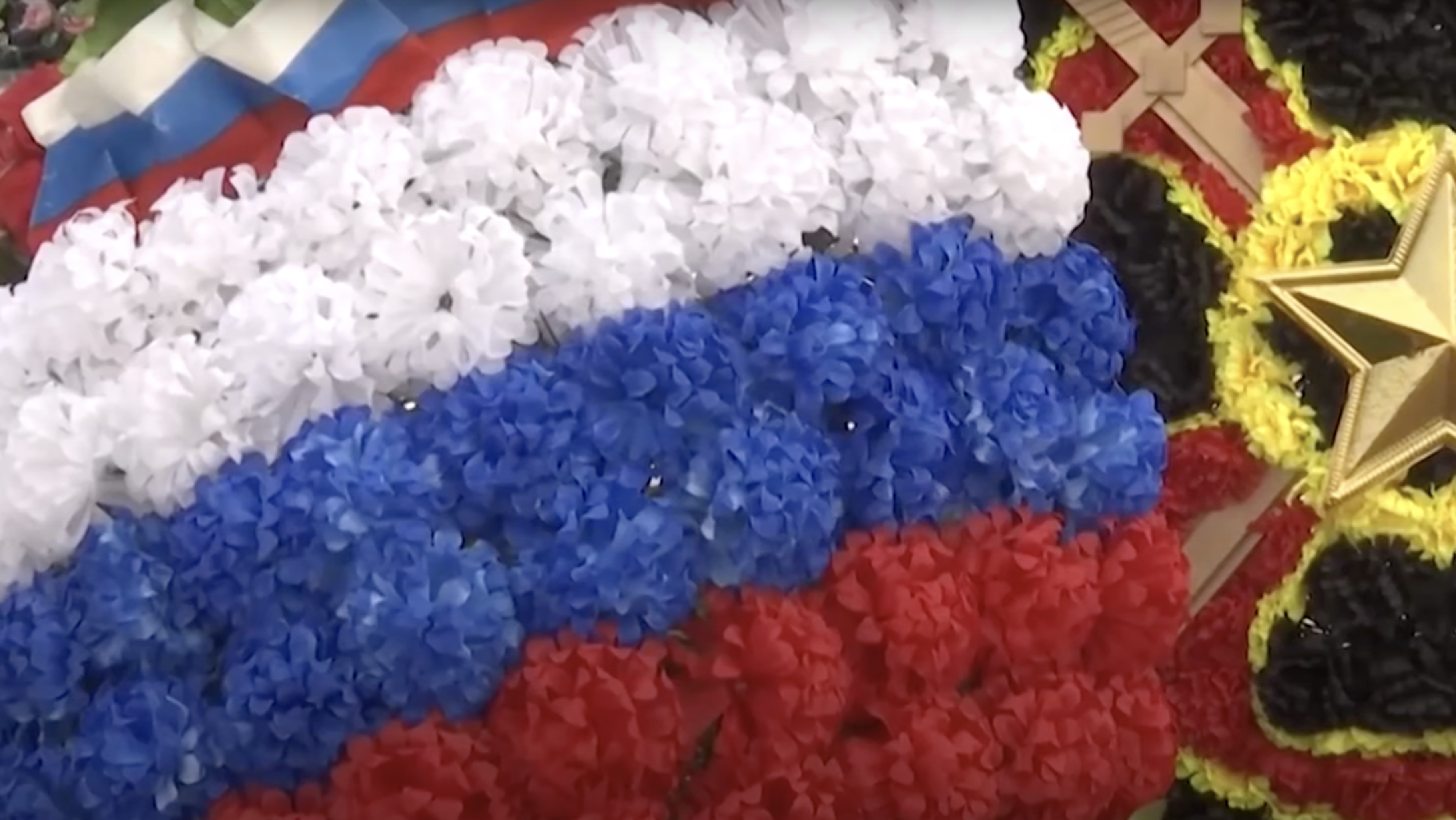 Een kortere zwarte driehoek ligt over de gele heen met daarop een witte vijfpuntige ster.