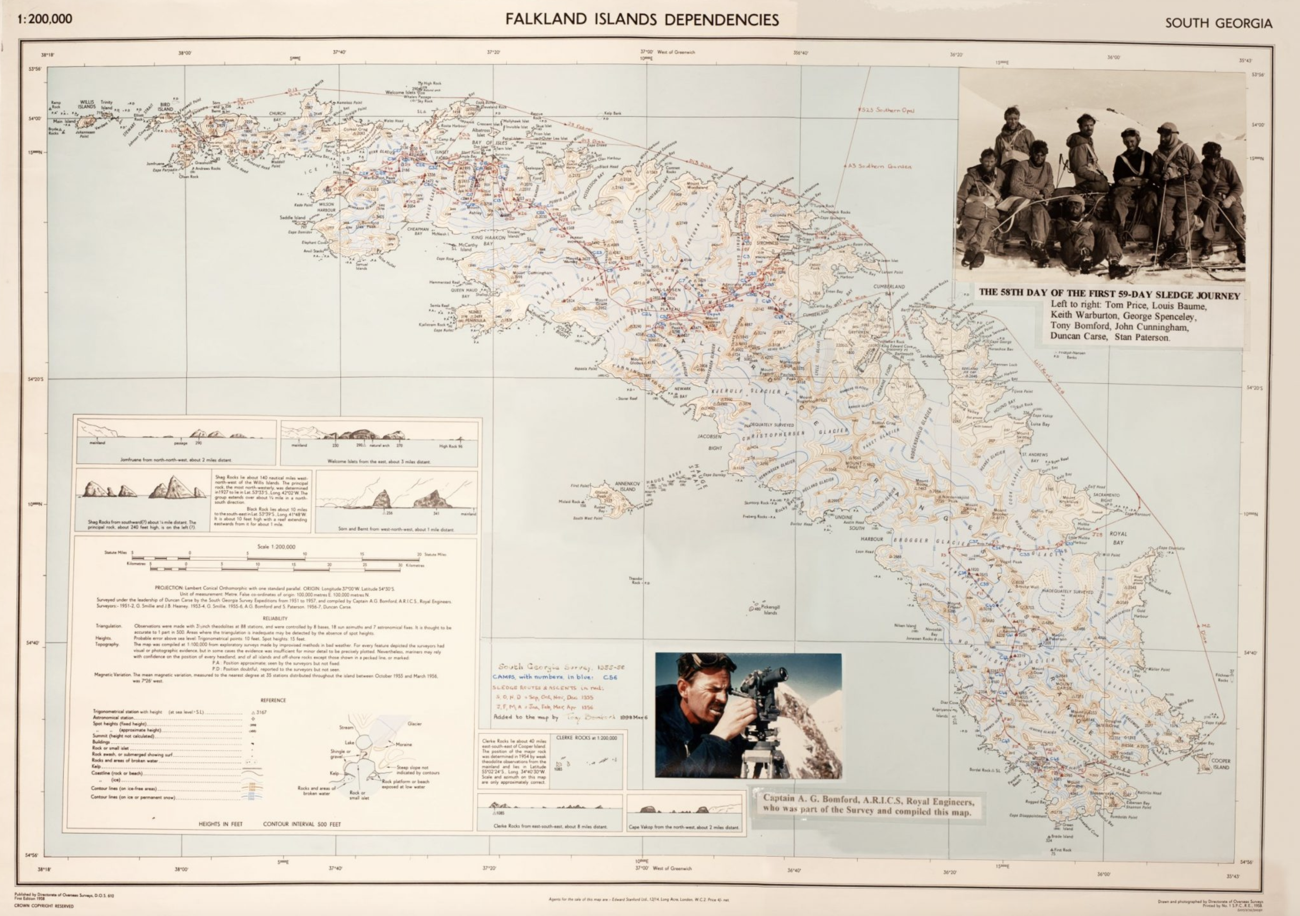 Begin jaren ’50 van de vorige eeuw werd na drie expedities de eerste uitgebreide kaart van Zuid-Georgia geproduceerd door de Australiër Tony Bomford (1927-2003)(onderste foto op de kaart), met de onderzoekingstochten werden er ook zo’n 200 nieuwe geografische namen toegevoegd, een aantal daarvan vernoemd naar leden van de expedities (Collectie South Georgia Museum, Grytviken)