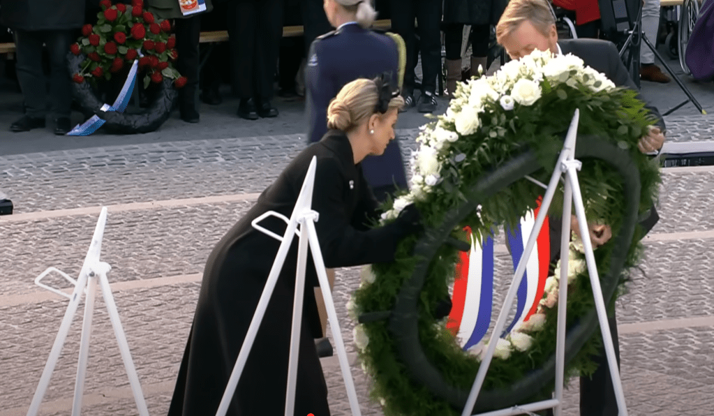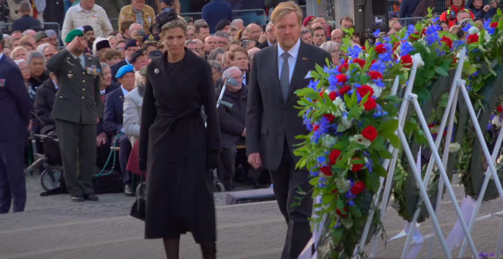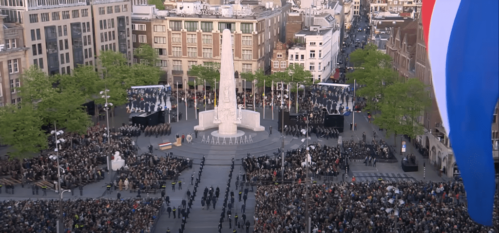 De Dam in Amsterdam op 4 mei 2025, met in het midden het cortège met o.a. koning en koningin, de burgemeester van Amsterdam en premier SchoofKoning en koningin plaatsen net vóór acht uur de eerste krans op de standaardHet Nationaal Monument tijdens de twee minuten stilteNa het plaatsen van alle kransen en de verschillende toespraken opent het koningspaar het defilé langs de kransen