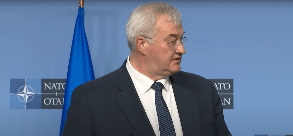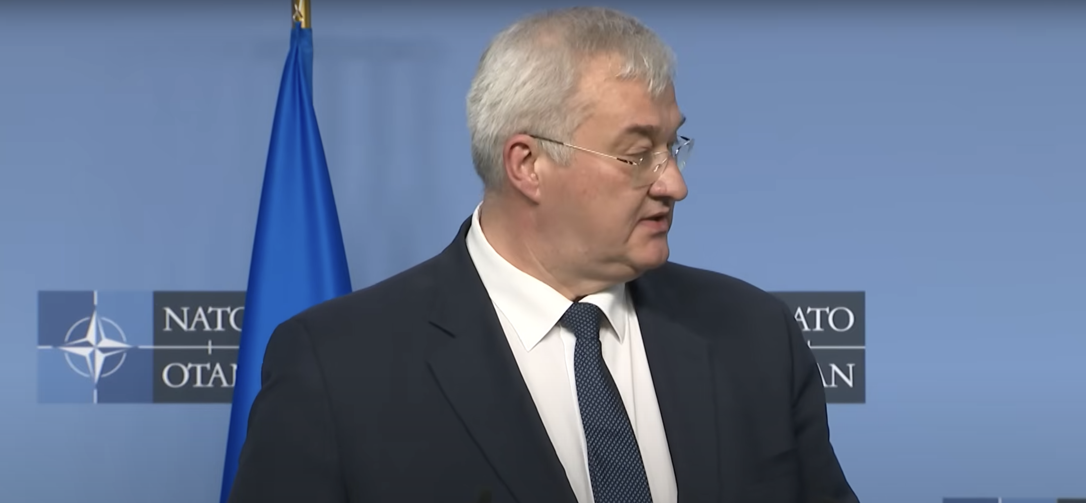 Andrii Sybiha (1957), minister van Buitenlandse Zaken van Oekraïne tijdens een recente persconferentie op het NAVO-hoofdkwartier in Brussel (screenshot)