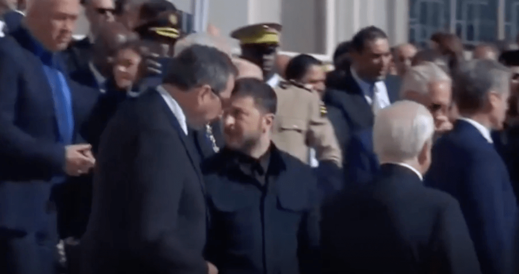 President Zelensky wordt naar zijn plaats begeleid voor de begrafenisceremonie van paus Franciscus in het Vaticaan (screenshot)