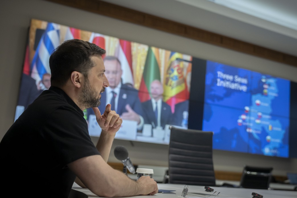 President Zelensky tijdens het laatste Driezeeëninitiatief afgelopen dinsdag (screenshot)