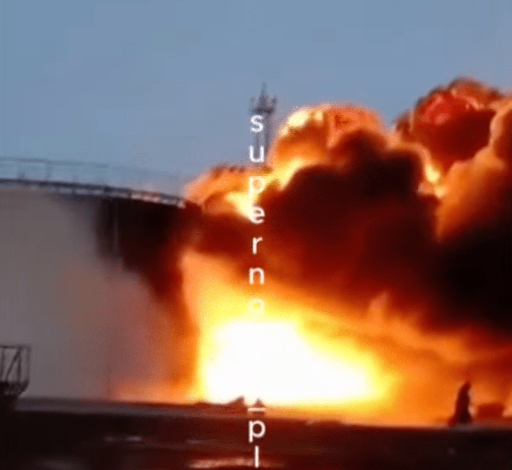 Een van de getroffen olieopslagtanks bij Engels (screenshot Supernova Plus)