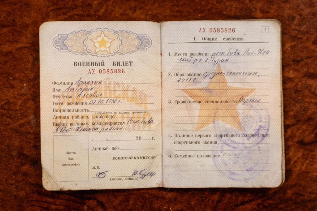 Militaire identiteitskaart van een van de Noord-Koreanen, waarin als geboorteplaats Turan wordt vermeld, een plaats die gelegen is in de Russische autonome republiek Tuva, dat een grens deelt met Mongolië, waaruit blijkt dat Noord-Koreaanse militairen kennelijk valse identiteitsbewijzen op zak hebben (foto gedeeld door president Zelensky op X)